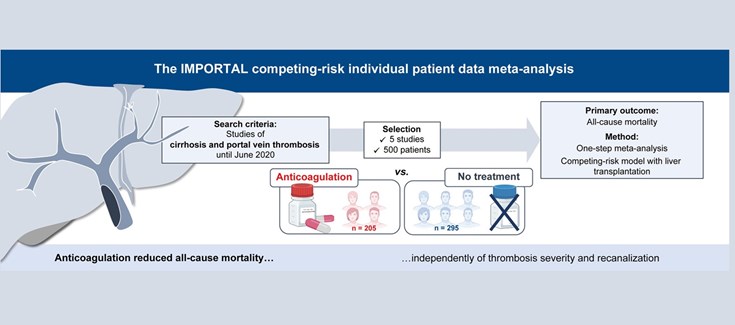 Guerrero A, Campo LD, Piscaglia F, Scheiner B, Han G, Violi F, Noronha-Ferreira C, Tellez L, 1, Reiberger T, Basili S, Zamora J, Albillos A. Anticoagulation improves survival in patients with cirrhosis and portal vein thrombosis: The IMPORTAL competing-risk meta-analysis. J Hepatol. 2023 Jul;79(1):69-78. doi: 10.1016/j.jhep.2023.02.023