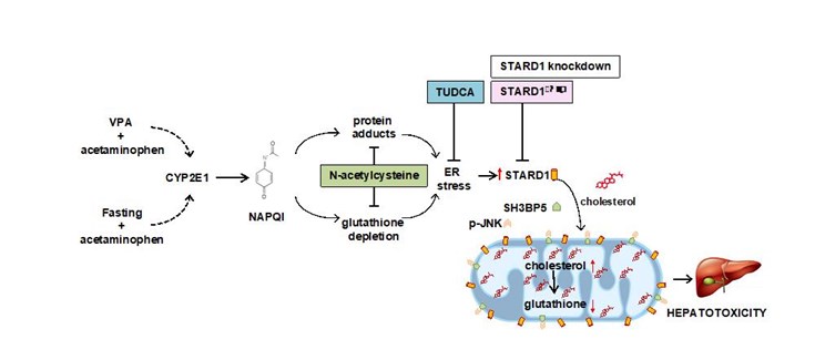 La acción de STARD1 en la mitocondria complementa y determina el papel de SAB y JNK, dos conocidas proteínas mitocondriales que inducen estrés celular, en la hepatotoxicidad del paracetamol. La inducción de STARD1 por VPA/parcetamol se lleva a cabo mediante el estrés en el retículo endoplásmico que se genera a partir del metabolismo del paracetamol en el hígado. La relevancia traslacional de dichas observaciones se constata utilizando un ratón (FRGN) con hígado humanizado en el que se ha reproblado con >80% con hepatocitos humanos y que muestran una susceptibilidad a la combinación VPA/paracetamol. Dichos estudios, pues, demuestran un papel clave de STARD1 en la hepatoxicidad por paracetamol, emergiendo como una nueva diana terapéutica.