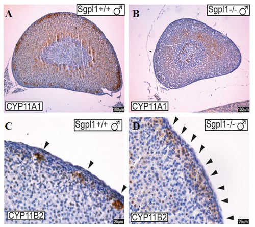 Fig. 1. Histología de la glándula suprarrenal. Déficit de expresión de enzimas de la esteroidogénesis CYP11A1 y CYP11B2 en ratones sin Sgpl1 (Sgpl1–/– ). (A, B) La enzima CYP11A1 (cholesterol side-chain cleavage) se expresa menos intensamente. (C, D) La enzima CYP11B2 (aldosterone synthase) no presenta la expresión moteada característica.