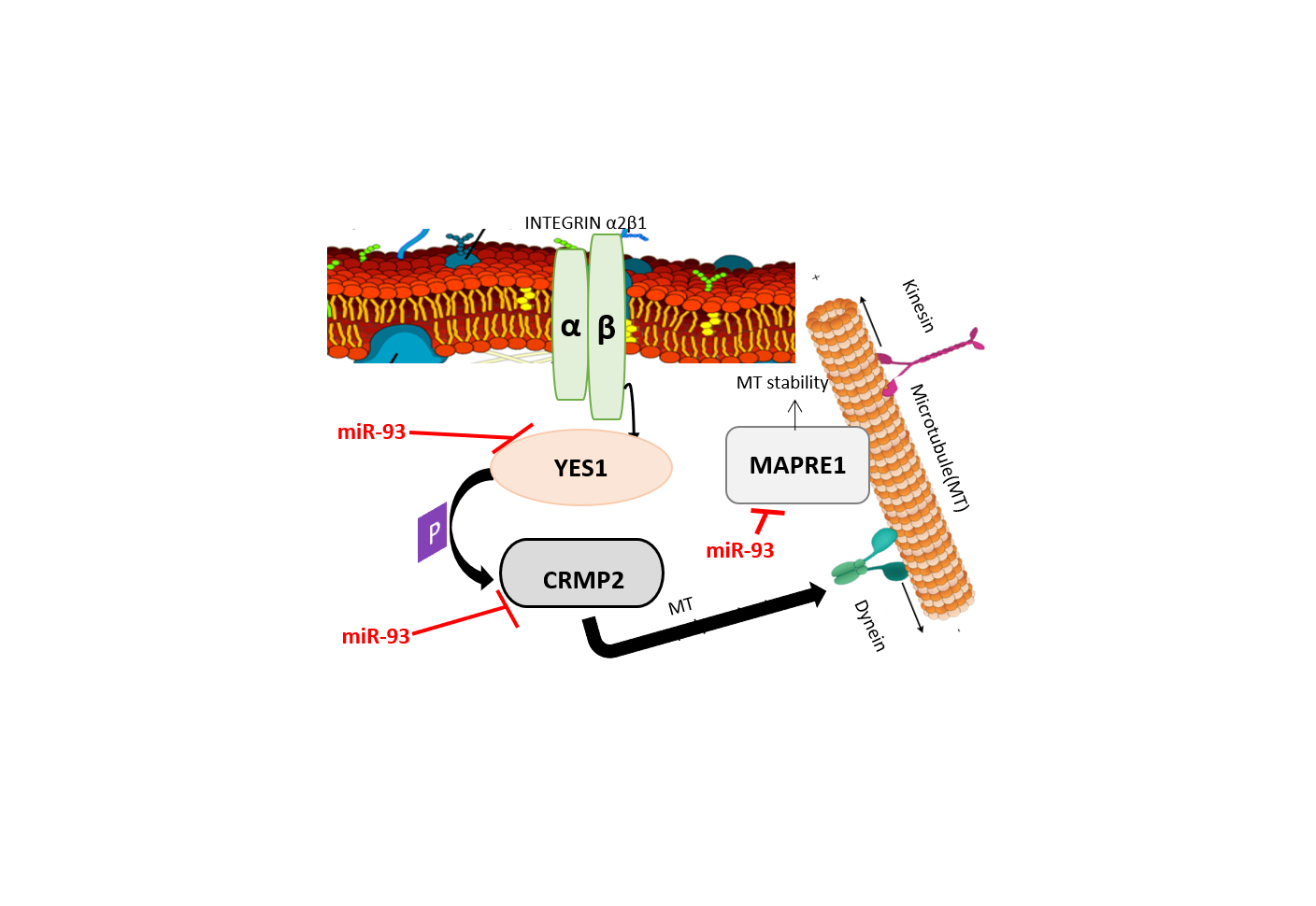 (*) Imagen. Representación esquemática del nuevo mecanismo de acción propuesto para miR-93 en el cáncer de páncreas a partir de los resultados obtenidos en el estudio. El miR-93 tiene la capacidad de regular la expresión de distintos genes implicados en la dinámica de microtúbulos a distintos niveles, como CRMP2, YES1 y MAPRE1. En un contexto en el que la expresión de miR-93 está aberrantemente aumentada, como sucede en los tumores pancreáticos, esto resulta en una alteración de dicha dinámica de microtúbulos provocando una alteración en el fenotipo y en el proceso de división celular.