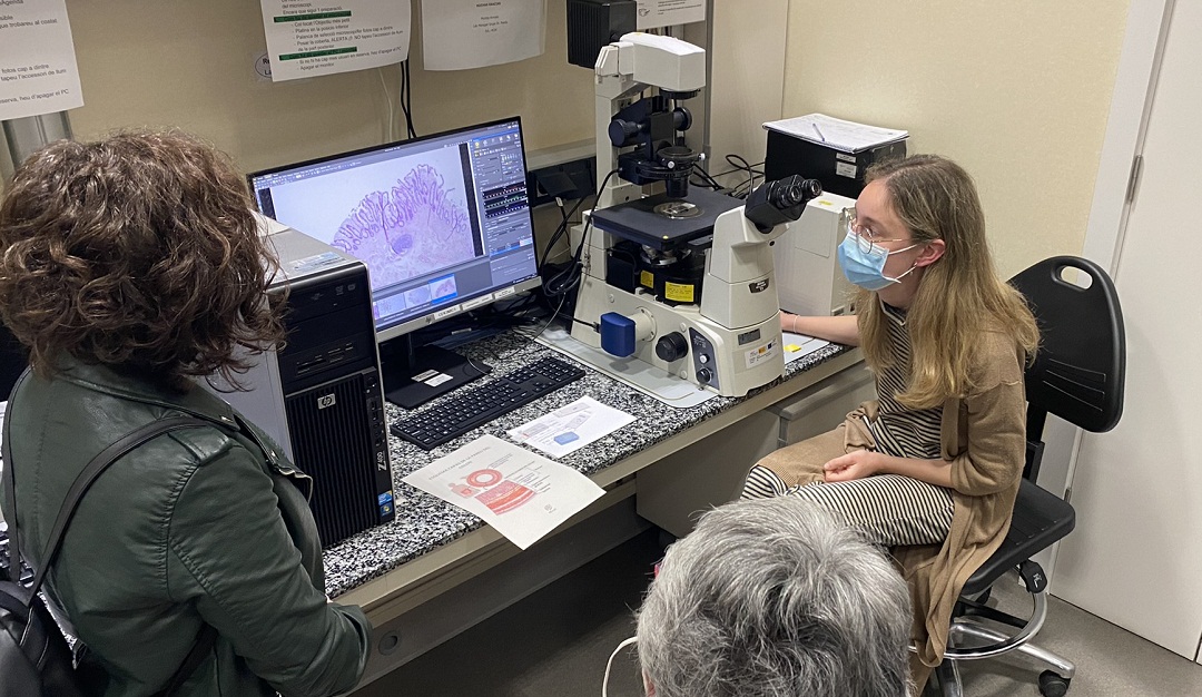 Los visitantes, pacientes de la Unidad de Enfermedad inflamatoria intestinal del Hospital Clínic, tuvieron la oportunidad de conocer en primera persona la investigación que llevan a cabo Azucena Salas, líder del grupo IDIBAPS Enfermedad inflamatoria intestinal y del CIBEREHD, y su equipo.