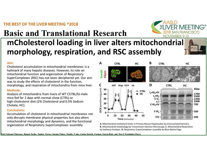 El trabajo “Cholesterol Loading in Liver Mitochondria Alters Mitochondrial Morphology, Respiration and Respiratory Supercomplexes Assembly” ha sido presentado por Estel Solsona-Vilarrasa (IIBB/CSIC) en la AASLD Liver Meeting celebrada en San Francisco, California, del 9 al 13 de noviembre.